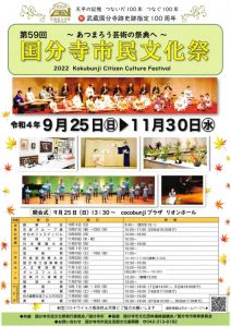 国分寺市民文化祭は、市民の文化活動を発表する場であり、市民文化の振興を図ることを目的としています。歴史と伝統を築いて59回目を迎える今年は、各団体が10月から11月にかけて舞台や展示などの発表をします。