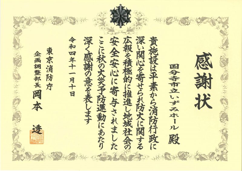 11月10日(木)に東京消防庁国分寺消防署による火災予防業務協力者表彰式が行われ、広報業務協力功労として当館が表彰されました。功労内容となった「秋の火災予防運動」横断幕掲出は、16日(水)まで正面入口に設置しています。
