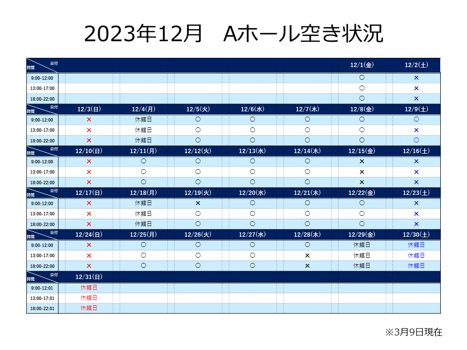 Aホール 2023年12月分の抽選受付につきまして、下記の通りご案内いたします。