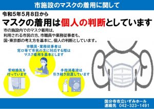 令和5年5月8日(月曜日)から、市の施設内でのマスク着用は、利用される市民の方、市職員や業務従事者も、国・東京都の考え方を基本に、個人の判断としています。