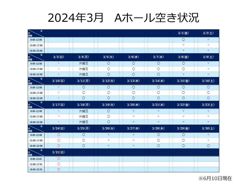 Aホール 2024年3月分の抽選受付につきまして、下記の通りご案内いたします。