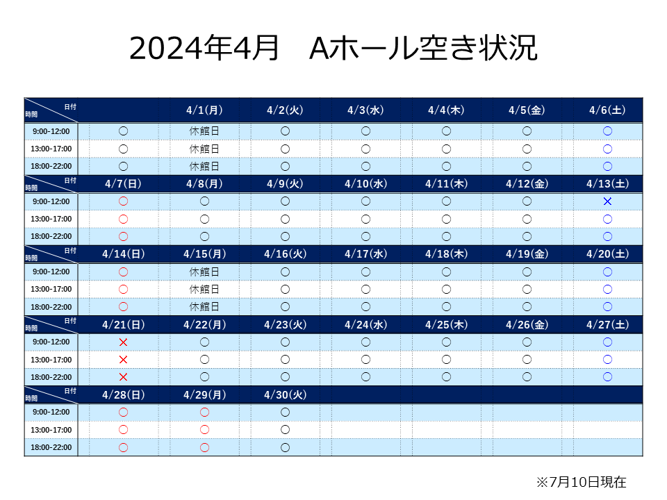 Aホール 2024年4月分の抽選受付につきまして、下記の通りご案内いたします。