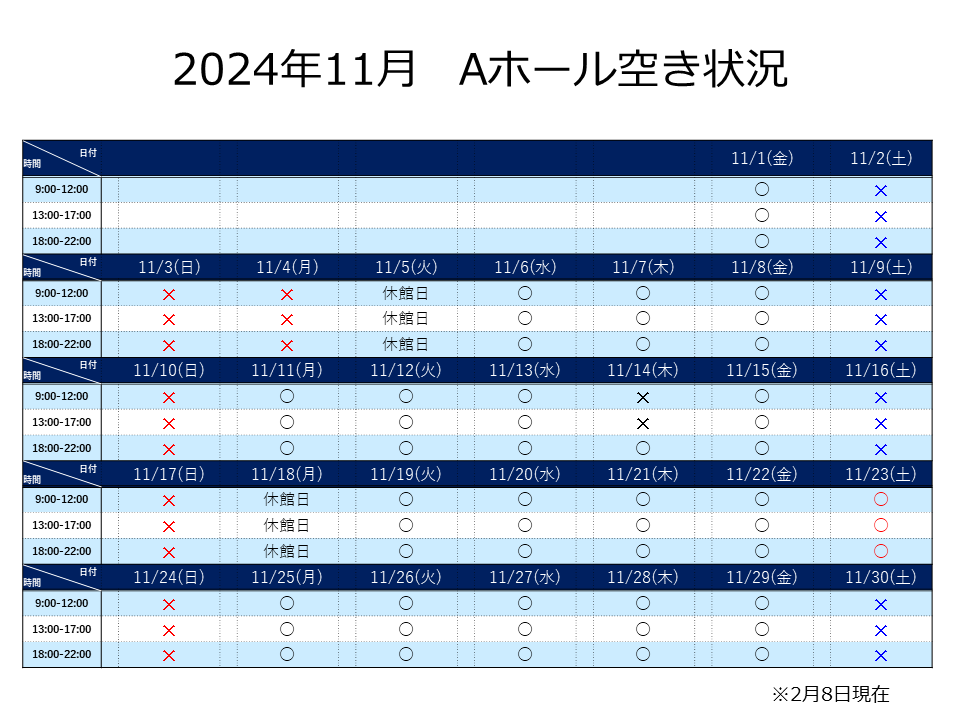 Aホール 2024年11月分の抽選受付につきまして、下記の通りご案内いたします。