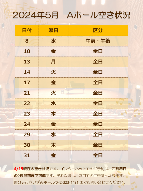 Aホール 2024年5月分の空き状況につきまして、下記の通りご案内いたします。