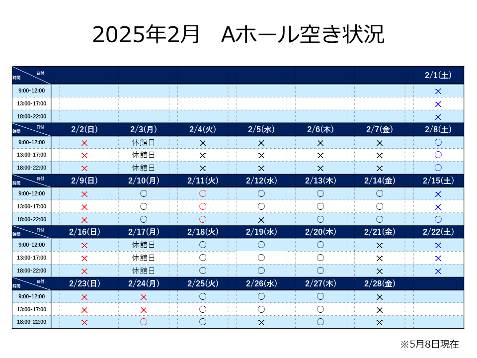 ○抽選受付期間:5月11日(土)~19日(日) ○使用状況(5月8日時点):下記カレンダーをご参照ください。 ※Aホール音響・照明設備修繕工事予定のため、貸出を休止する期間があります。
