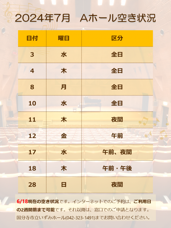 Aホール 2024年7月分の空き状況につきまして、下記の通りご案内いたします。
