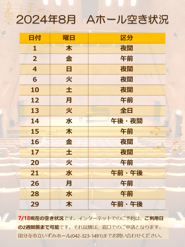 Aホール 2024年8月分の空き状況につきまして、下記の通りご案内いたします。