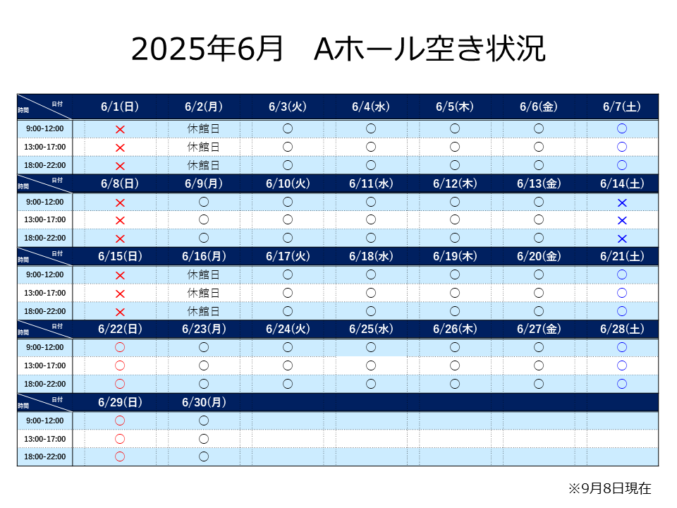 Aホール 2025年6月分の抽選申込につきまして、下記の通りご案内いたします。