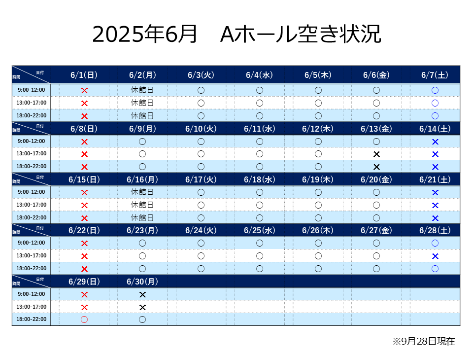 Aホール 2025年6月分の先着予約につきまして、下記の通りご案内いたします。
