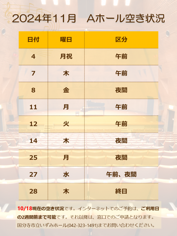 2024年10月18日 Aホール 2024年11月分 空き状況のご案内