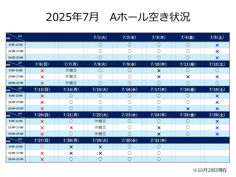 Aホール 2025年7月分の先着予約につきまして、下記の通りご案内いたします。