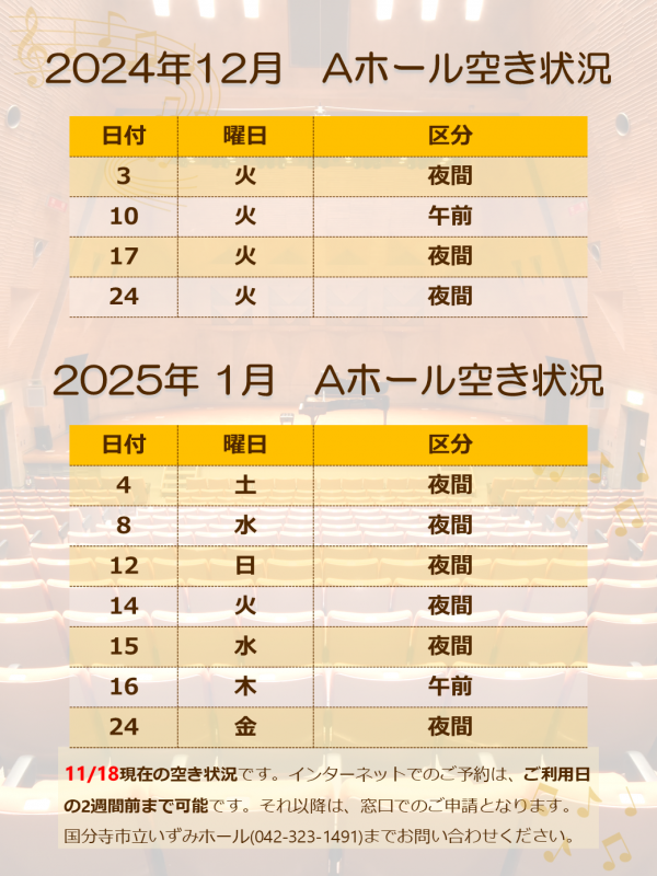 2024年11月18日 Aホール 2024年12月分・2025年1月分 空き状況のご案内